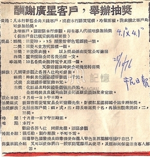 广星为酬谢客户,举办抽奖。奖品丰富,现场仲有特别奖,凡到场参观人仕均可参加,抽奖仪式邀请三菱公司斋藤,香港影视红星温柳媚主持抽奖。广告文案:资格:凡本行新旧公共天线客户,或在本行购买电视,冷气雪柜,洗衣机之客户均可参加抽奖。上项客户,请莅临本行参观,即有专人代填咭参加抽奖(倘客户自己填妥表格则更佳)奖品:头奖:三菱20' 3S显像管彩色电视机一架。二奖:三菱六立方呎雪柜一个。三奖:三菱洗衣机, 以上奖品系由菱电公司送出。四奖:丽明灯饰公司名贵吊灯一支。幸运奖:10名各奖金狮牌电子瓦撑一个。又蒙碧丽姿时装公司送出特别奖。办法:凡到场参观之各界人士均可参加。头奖:时装及化粧品礼券价值一千元。弍奖:皮褛礼券价值陆百元。叁奖:化妆品及时装礼券价值叁百元。全部时装及皮褛均由该公司高级裁缝师度身定做。截止日期:十月卅一日下午三时正。地点:本行。欢迎各界人仕 同业先进,莅临参观特别介绍:模型船,制作精致,不可不看。现场彩色摄像机及录像机使你进入彩色世界点解唔睇吓自己?保养示范介绍 又可以使你明白一般家庭电器用具使用,及应如何保养并有专人解答。