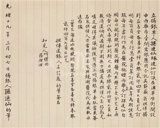 1956年《大眾報》登載文章講述孫中山先生在1892年第一次向鏡湖藥局借款二千大員,五年期滿,已由吳節薇先生代還。孫中山先生第二次借款在光緒十九年三月初七日(1893年4月22日),孫中山先生在澳門草堆街開設中西藥房,向鏡湖醫院益善堂借二千四百[圓],相當白銀1728兩。該行息作為鏡湖醫院施贈西藥之用,孫中山先生自願每日親到鏡湖醫院贈醫兩點鐘。擔保還銀人吳節薇及知見人何穗田為當年總理,知見人羅澄波為前任總理,亦是倡建值理富紳曹應賢(曹有)的姻親。圖為孫中山先生向鏡湖醫院藥局第二筆借款揭單,原件現藏於北京“宋慶齡故居管理中心”。