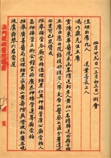 光緒二十二年三月初七日(1896年4月19日)集院,議粵西賑捐擬三月初十日(4月22日)繳摺經於初三日(4月15日)先行匯省廣仁善堂銀五佰元彙收代賑以後收齊,除匯項外盈餘多寡可否匯往該堂彙賑,仰祈卓奪。公議收齊然後定奪。