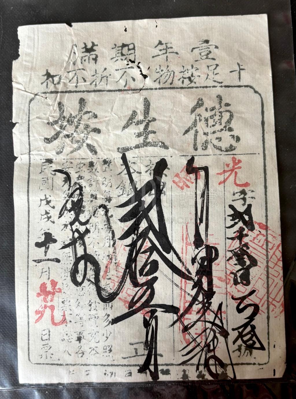 德生按是清末至民國時期澳門最具代表性的典當行之一,服務華人社區,是近代澳門金融史的重要見證。當票上的手寫書法,屬於典型的行草體商業書寫,是當時典當行「當票字」的標準風格。