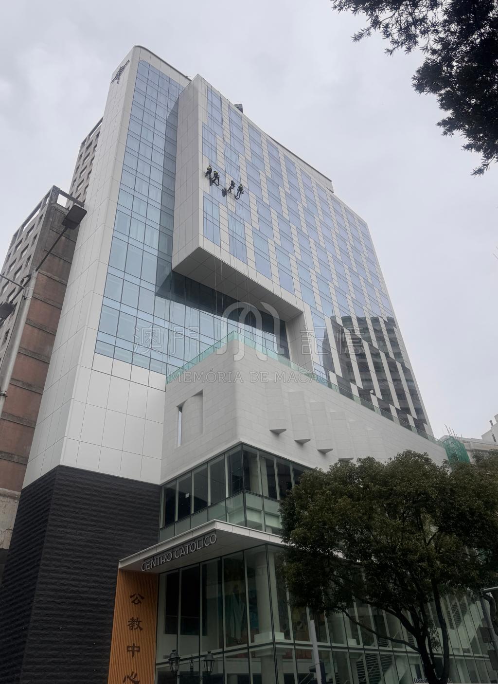 相片攝於2026年2月7日,地點為重建的公教中心。相片中的工作人員正在努力清潔窗戶,迎接開幕。