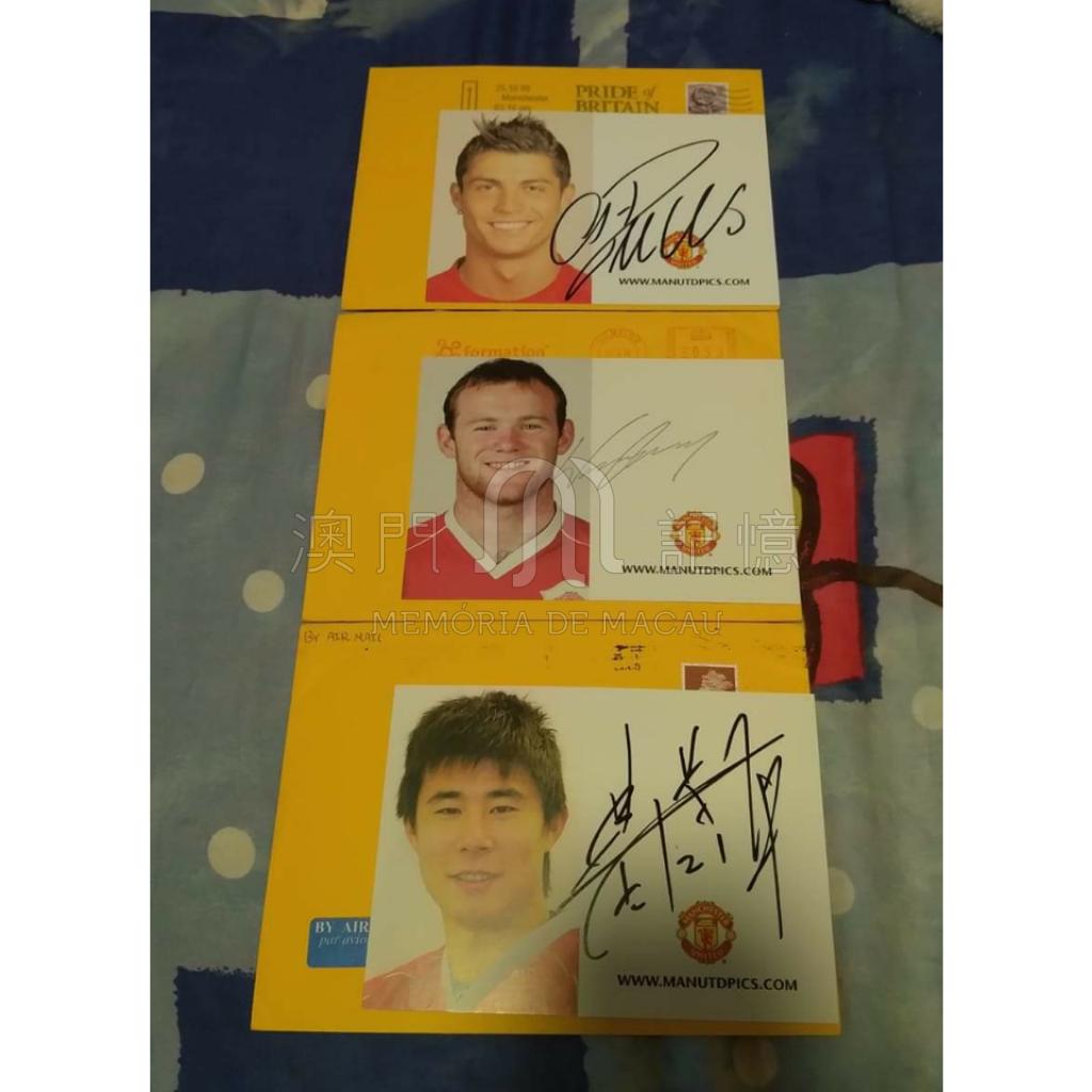 2008年,收到來自英國曼徹斯特的曼聯簽名卡,分別來自C朗、朗尼和董芳卓,最犀利一定是有澳門郵戳加持,來得特別有親切感。當我見到三封回信在我信箱,我投了滿意一票給澳門郵政!