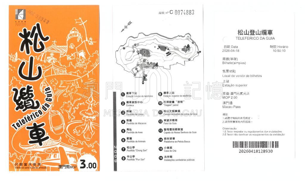 圖中左邊和中間分別是民政總署(現市政署前身)印製的松山纜車車票正面和背面,右邊是現在熱敏紙版本的松山纜車車票。澳門第一座登山纜車於1997年10月1日起正式啓用,這項設施是松山改造公園及二龍喉公園擴建計劃中最突出的專案之一。登山纜車月台起點設在二龍喉公園入口處,終點在松山公園小水塘(俗稱鱷魚潭)附近,全長186米,遊客可在纜車內飽覽東望洋山一帶的景色。澳門立法會於2018年7月通過《市政署》法,根據此法,市政署在2019年元旦設立。市政署的歷史可追溯到回歸前的市政廳,回歸後的臨時市政局、民政總署都是市政署的前身。