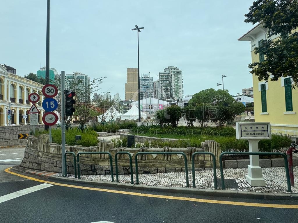 此街景從巴士上拍攝,拍攝相片的方位背向民居,居民落街即見此處。景物資訊豐富也有故事性,充分展現澳門「麻雀雖小,五臟俱全」的特色。街名很明影地展示著「高偉樂街」,左邊是文化局及衛生中心,右邊是塔石廣場及青少年展藝館,早晨時段更有鴿子覓食;拍攝時所在巴士向的前方可往以前未興建的隧道,或往社工局及鏡湖醫院。