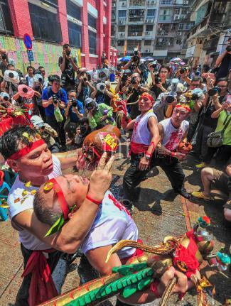 觀眾在媽閣廟前地欣賞南獅賽事,可飽覽融合不同地區文化特色的舞獅運動,感受獨特的醒獅文化。