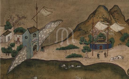 圖4 〈真蒂洛尼家族原藏中國貿易港繪畫系列:澳門(十八世紀晚期)〉中的關閘(圖中左側)。