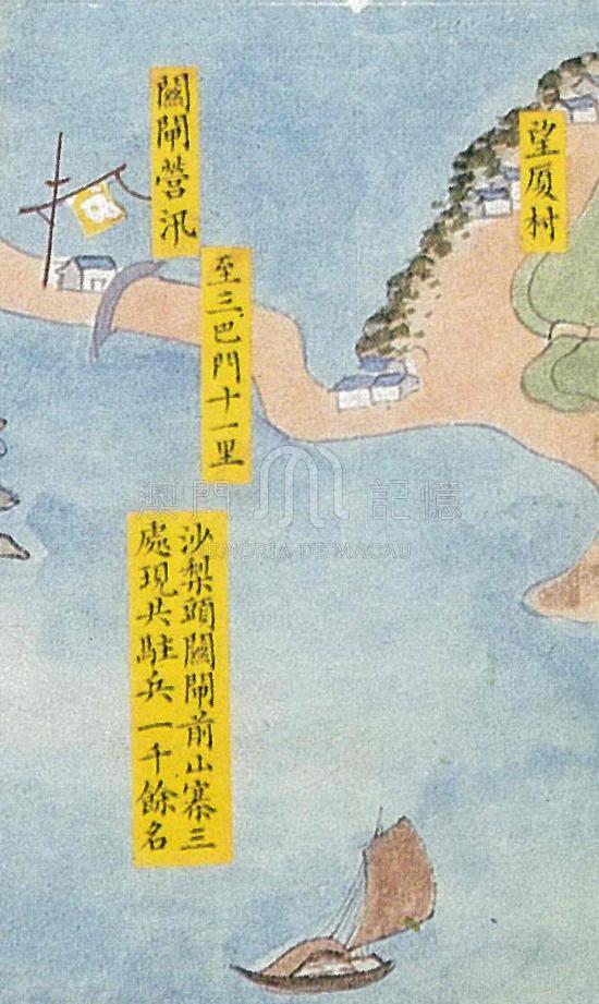 圖7 〈澳門形勢圖〉中的關閘,1808年。另外,有文字標注稱“︁沙梨頭、關閘、前山寨三處現共駐兵一千餘名”。引自中國第一歷史檔案館、澳門一國兩制研究中心選編:《澳門歷史地圖精選》,北京:華文出版社,2000年,第77頁。