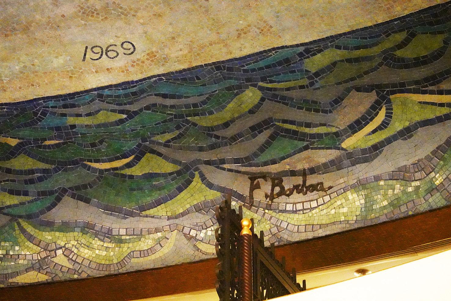 圖3 酒店大堂天花馬賽克壁畫鮑博的簽名及創作年份。筆者攝。