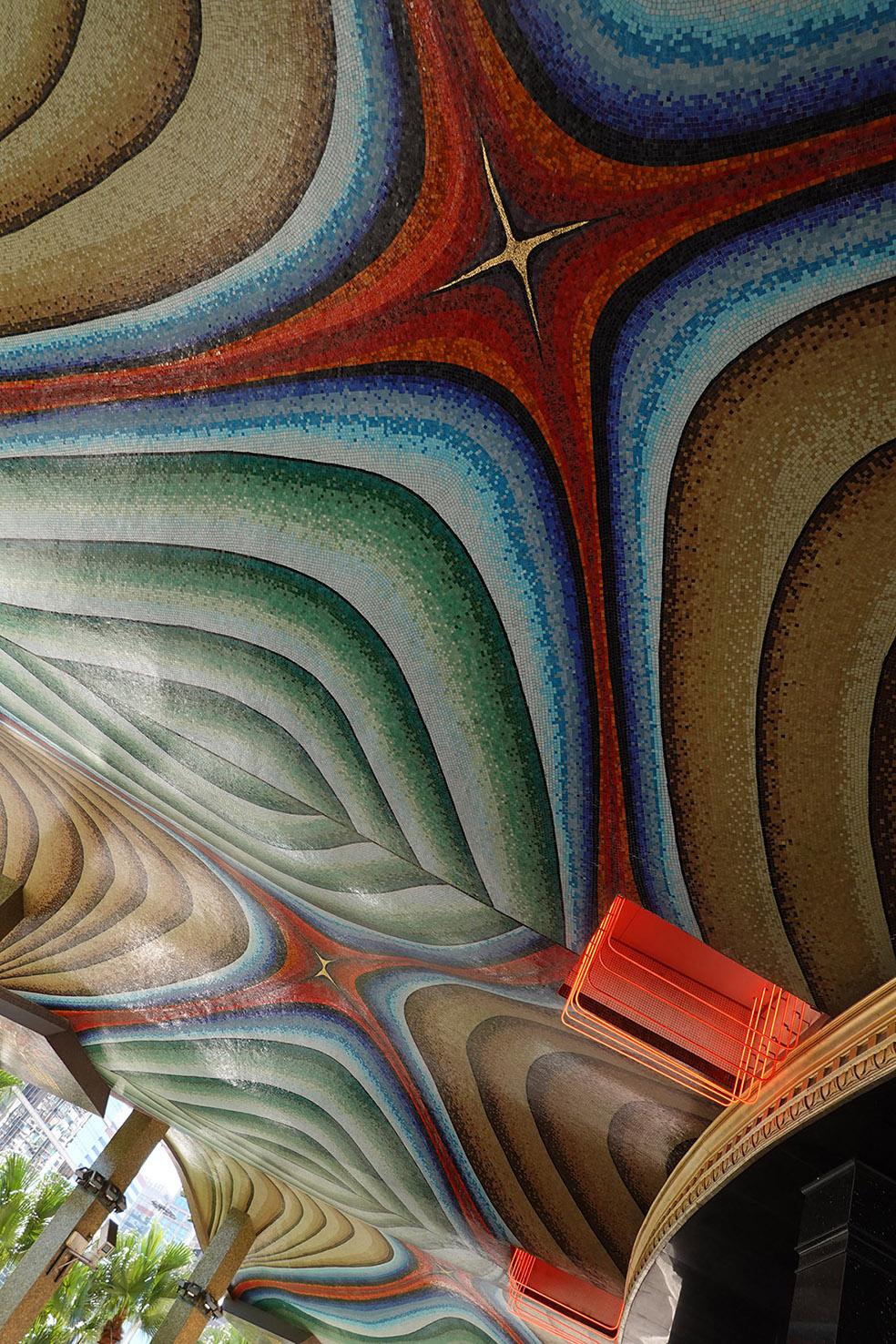 相對於酒店大堂的寫實風格,酒店入口的天花壁畫則採用抽象風格。