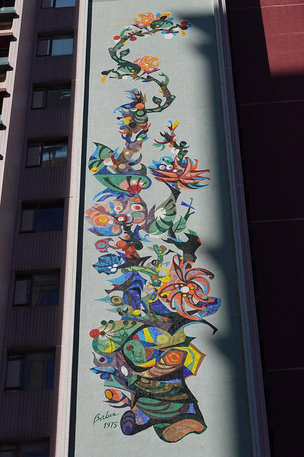 圖5 新麗華酒店外壁的馬賽克壁畫有鮑博的簽名及創作年份。筆者攝。