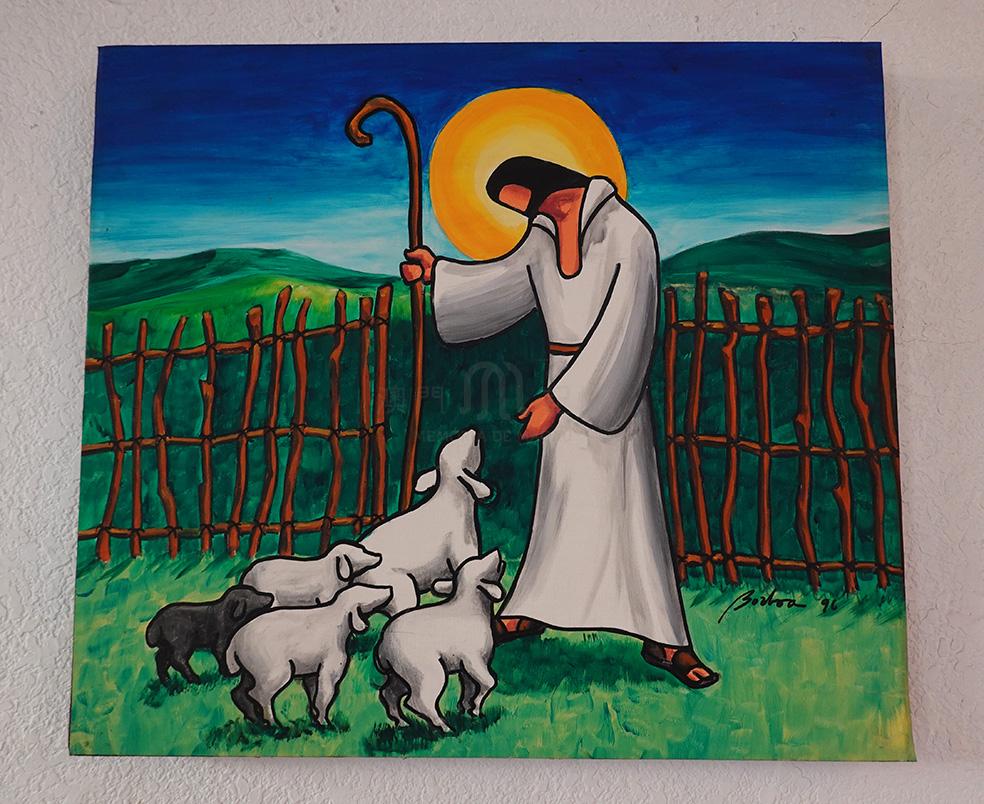 首先是在聖若瑟勞工主保堂(1996年),是筆者所見唯一一幅畫在油畫布上的油畫,題材是耶穌與羊群,筆者比對後認為該畫可能是花地瑪教堂馬賽克畫的原稿,但是畫面左右反轉。