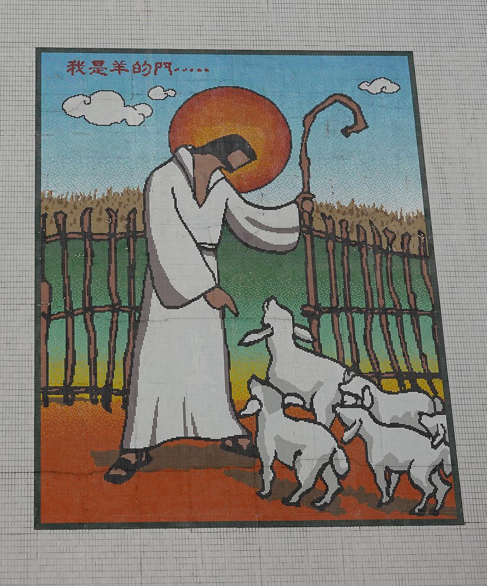 第三幅壁畫在台山花地瑪教堂外牆(無簽名及無年份),題材是耶穌與羊群,畫面有中文語句“我是羊的門…”。