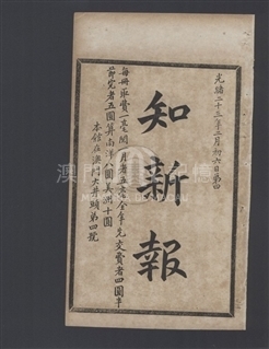 《知新報》第四期刊登《地球大勢公論總序一》、《養民要折》、《中國盛衰關於地球全域》、《失權可憤》等文章。《知新報》於1897年2月22日(清光緒二十三年正月二十一日)創刊,由康有為籌劃出版、梁啟超兼理筆政、何廷光(字穗田)出資、康廣仁則負責具體運作創辦,該報於維新運動時期所創辦,為維新派在華南地區的重要刊物。1898年(清光緒二十四年)的百日維新失敗後,《知新報》仍繼續出版。1899年7月20日,康有為在加拿大創立保救大清皇帝會後,更將《知新報》與《清議報》定為會報。《知新報》原按上海《時務報》模式創辦,初擬為《廣時務報》。及後經梁啟超斟酌後,才定名《知新報》,報頭使用篆書。其辦報宗旨,正如其創刊文章的「知新報緣起」指出:「不慧於目,不聰於耳,不敏於口,曰盲、聾、啞,是謂三病」而「報者,天下之樞鈴,萬民之喉舌也,得之則通,通之則明,明之則勇,勇之則強,強則政舉而國立,敬修而民智。」《知新報》是澳門第二份中文報紙,翻譯不少西文報刊,錄英、俄、德、法、美、日等各國大事,同時遠銷海外舊金山、悉尼、安南、新加坡等地。設社址於澳門南灣大井頭四號,其後在1900年11月22日(清光緒二十六年十月初一)出版的第129期有遷館告白:從大井頭四號移寓至門牌十九號。初為5日刊,自1897年5月31日(清光緒二十三年五月初一)的出版的第20冊起,改為旬刊 (十日刊),篇幅較前增加一倍;又至1900年2月14日(清光緒二十六年正月十五日)出版的第112冊開始,再改為半月刊,每期約60餘頁,冊裝。目前所收集的最後一期是1901年2月3日(清光緒二十六年十二月十五日)出版的第134冊,是否仍有後續出版的刊冊,有待進一步研究。本會感謝中山大學圖書館的支持,合作將該館珍藏的共134冊《知新報》原件進行電子化,得以在此平台與公眾分享。此外,本會為每期之目錄加設鏈結功能,以便各方讀者閱讀。《知新報》主要撰述和譯者如下:撰述:何樹齡、韓文舉、梁啟超、徐勤、劉楨麟、王覺任、陳繼儼、歐榘甲、康廣仁、黎祖健、麥孟華、林旭、孔昭炎、康有為 英譯:周靈生、盧其昌、陳焯如、甘若雲葡譯:宋次生德譯:沙士日譯:唐振超、山本正義、康同薇