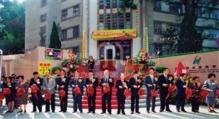 拍攝日期:1999年11月16日 前排左起:尹一橋院長、梁秀珍秘書長、廖澤雲校董、彭彼得副主席、曹榮貴副部長、董樂勤政務司、何厚鏵候任行政長官、韋奇立將軍、馬萬祺主席、黎祖智政務司、李水林副社長、崔世安候任司長、許世元董事、何陳瓊女士、周金陵顧問。